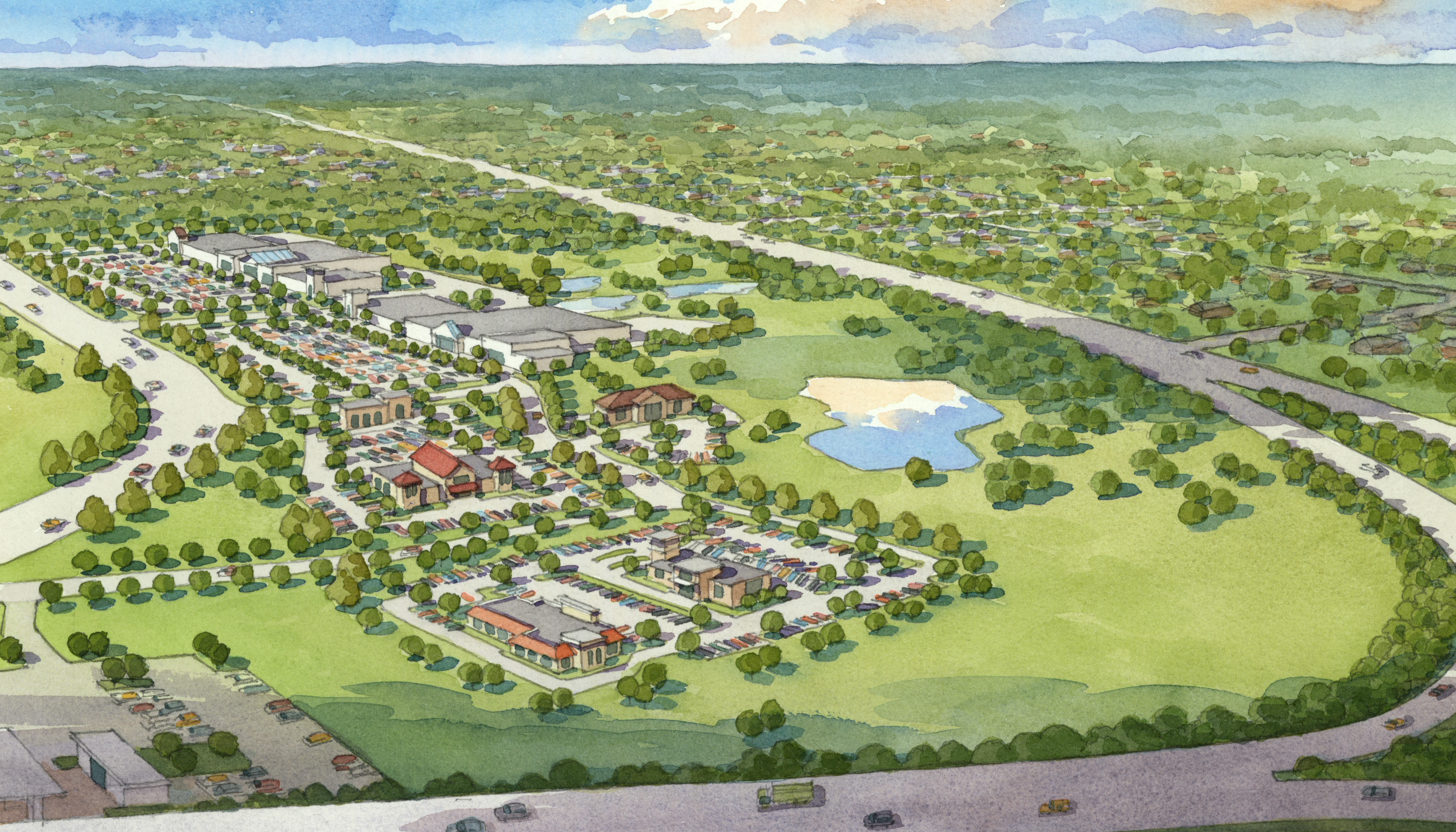 The planned location of Austin Ridge is in eastern Virginia, along Austin Ridge Drive in Stafford, right off I-95. It's planned to have several retailers across seven buildings on a large, lush campus with two ponds and park-like green space.